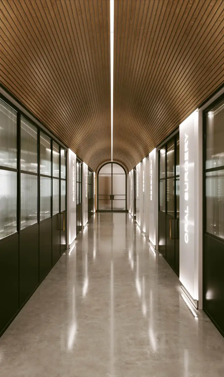 This bespoke clinic fit-out in central Mauritius features five surgical rooms, including a state-of-the-art oral surgery suite. Additional amenities include a lab, recovery room, and CBCT room. The public spaces showcase high-end finishes, with custom elements like a curved timber soffit, wall light boxes, and mosaic tile floors.