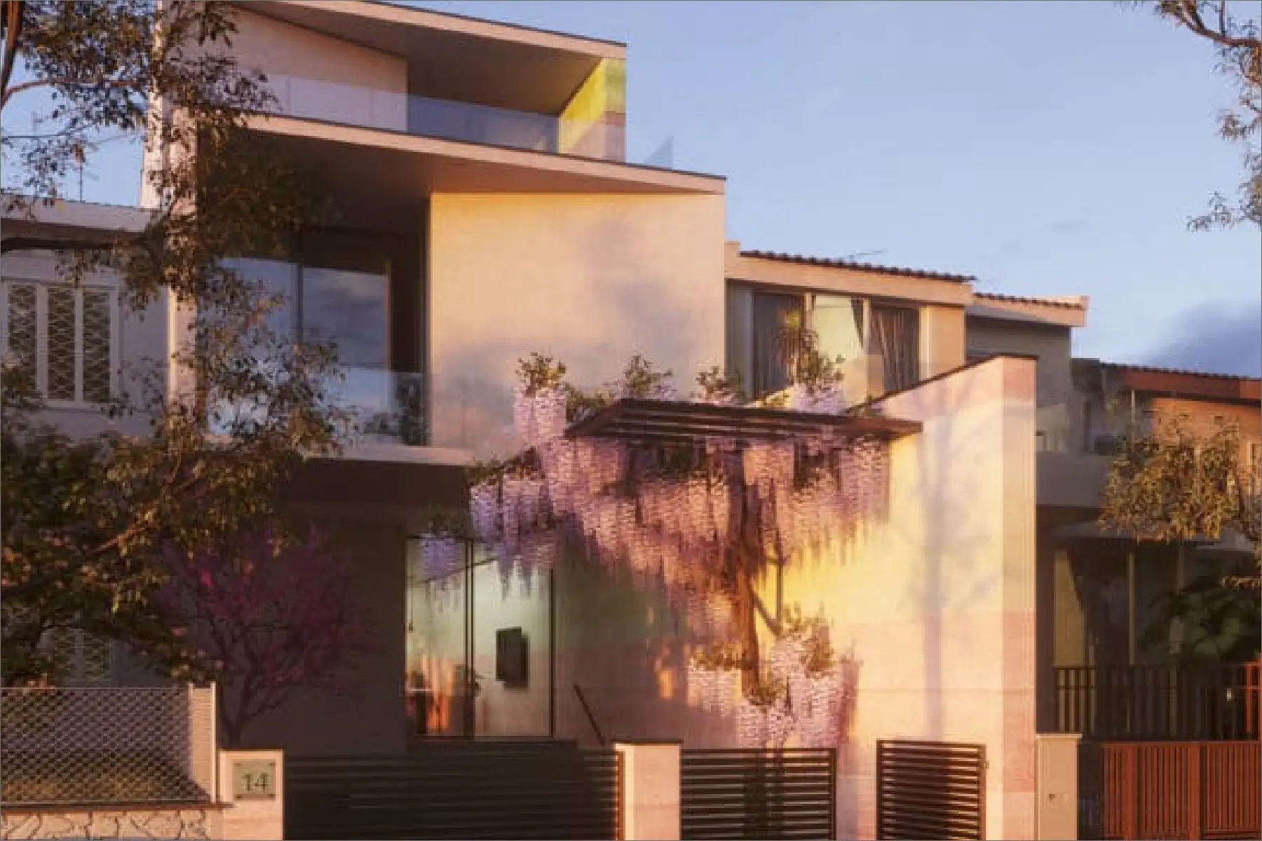 The exterior showcases a shifting facade that not only articulates the design but also provides essential shading for the bedrooms and living spaces.