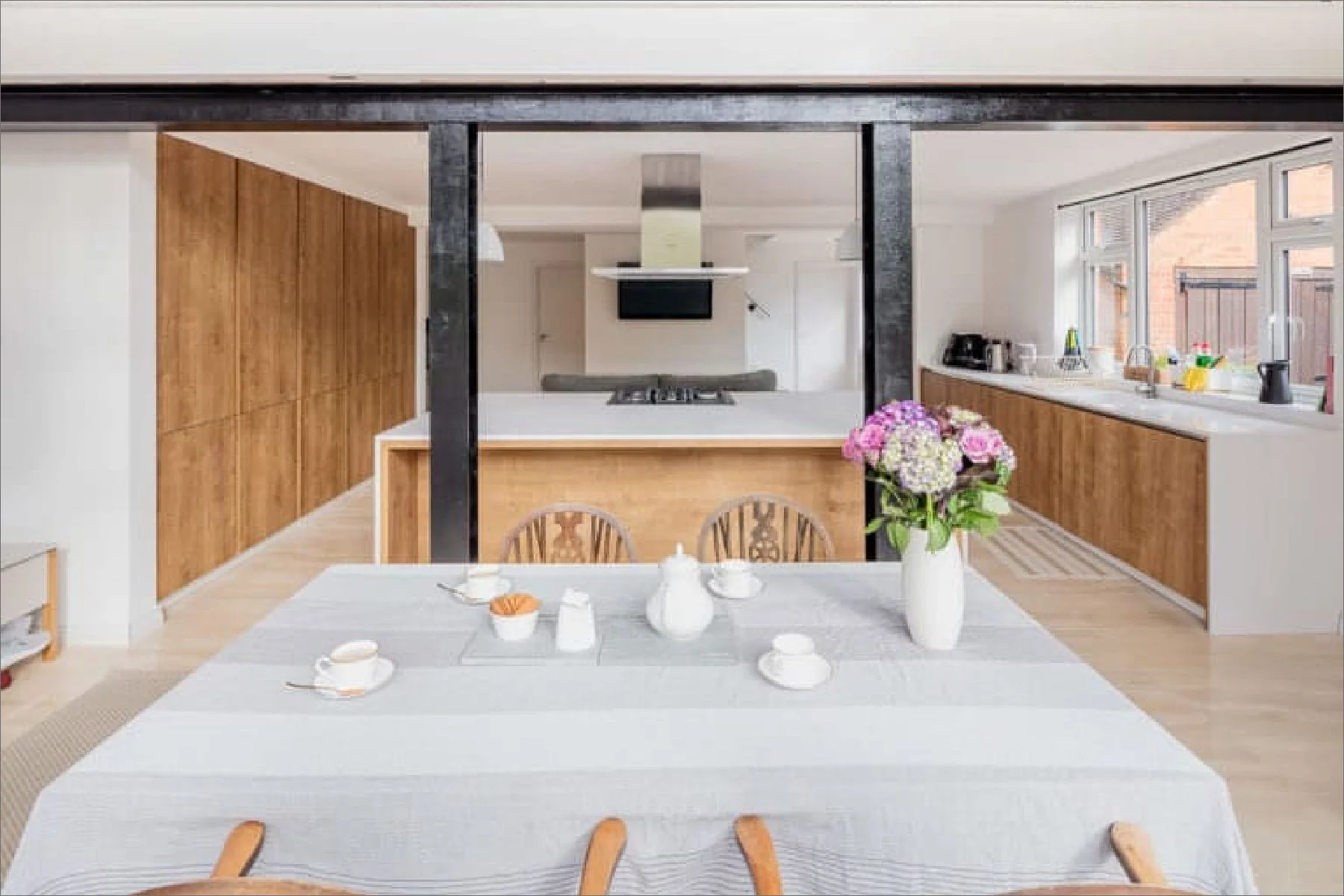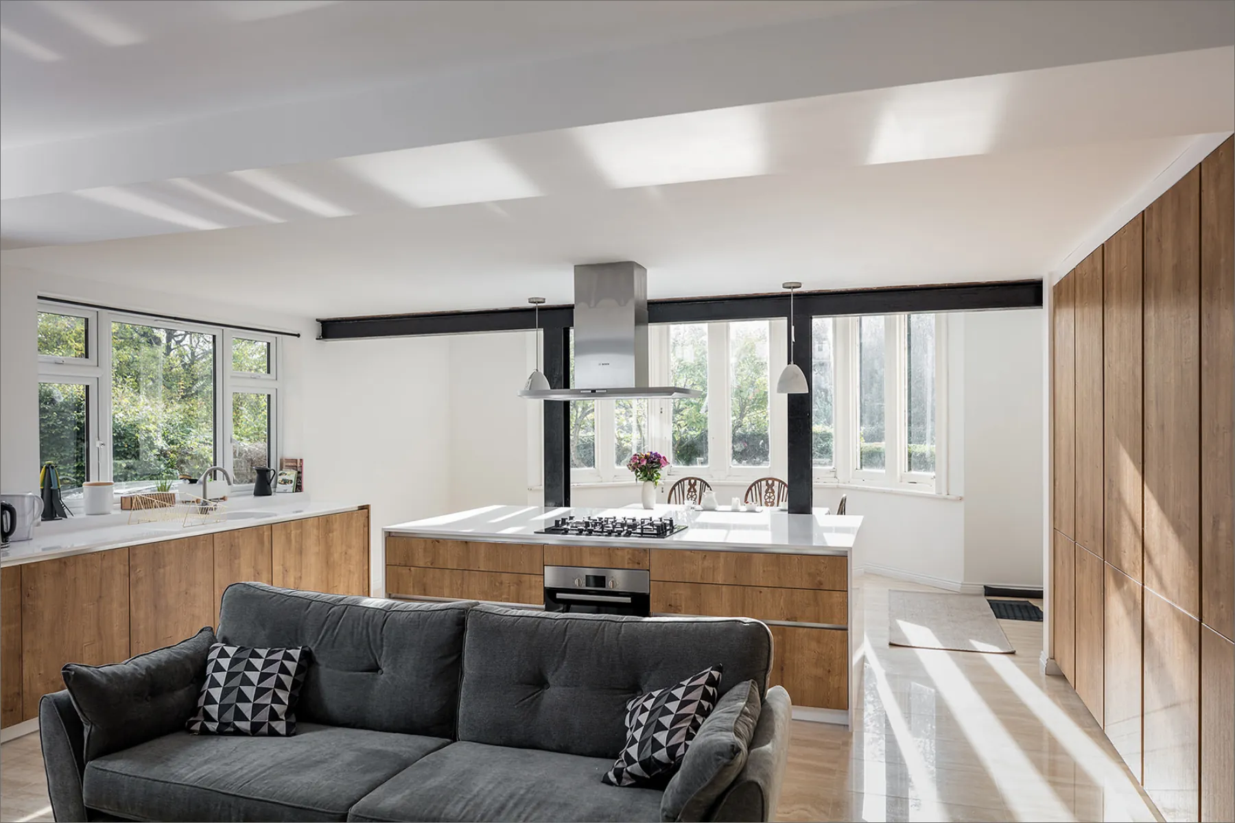 The brief focused on increasing natural daylight and reconfiguring the layout for a functional and beautiful home. The house was gutted to create open-plan living areas and rooms flooded with light.