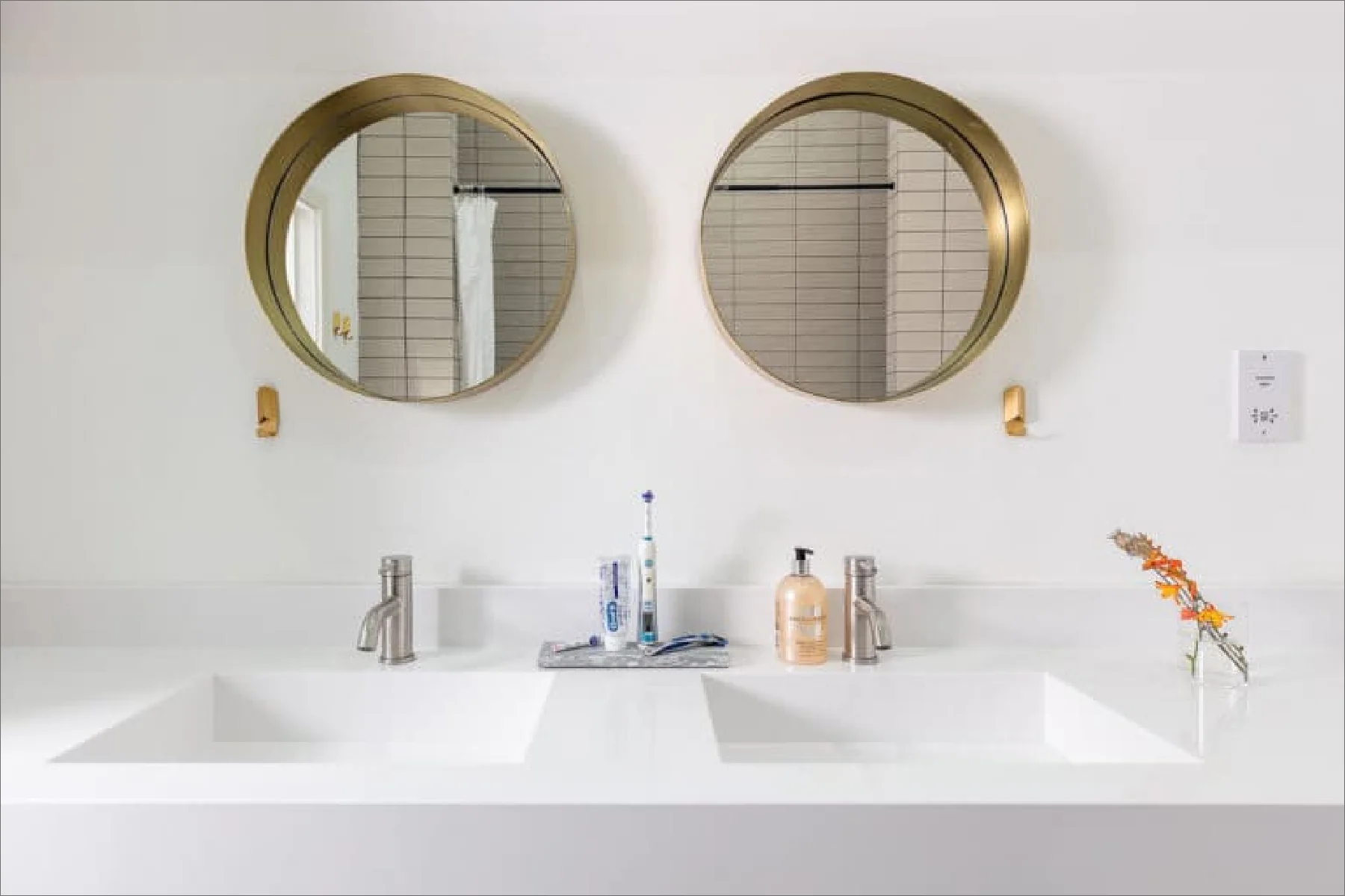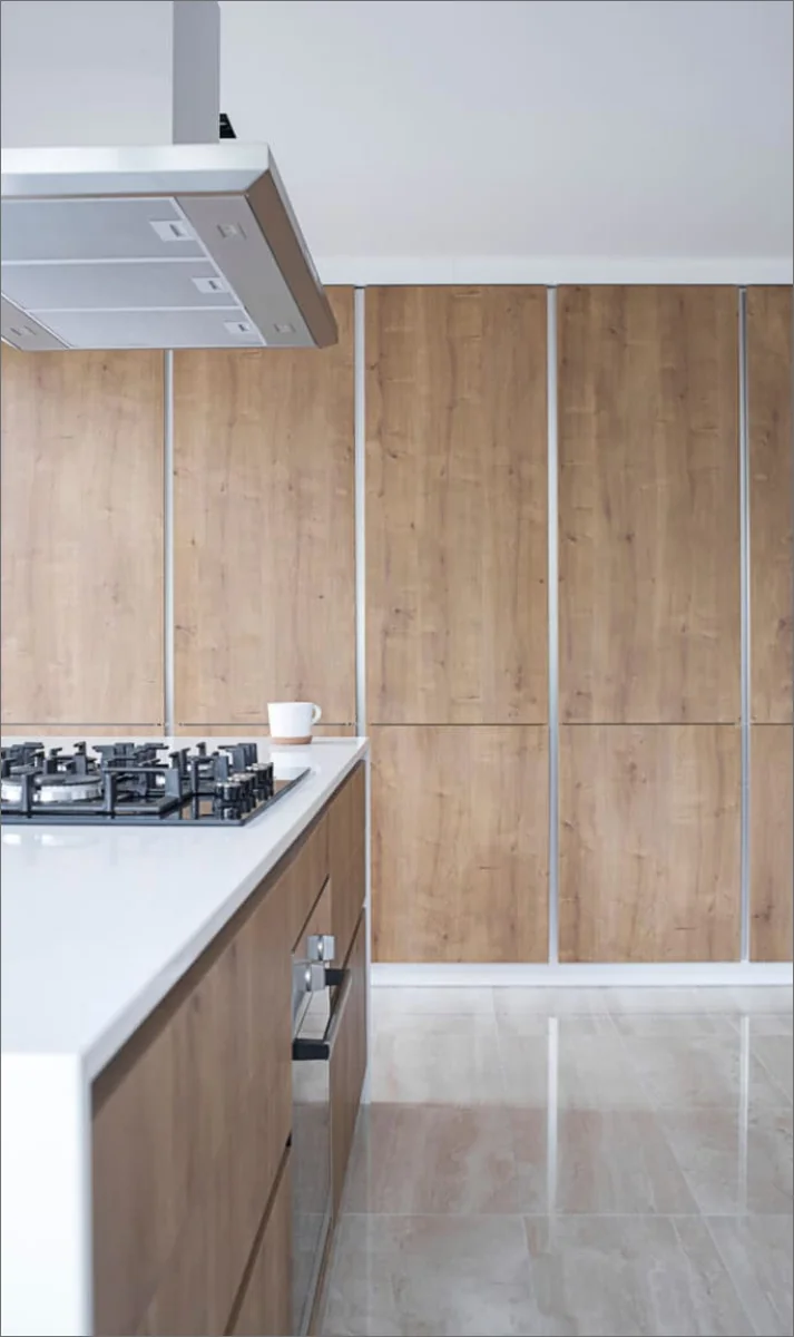 Ruta’s material palette features timbers and Silestone, applied differently throughout the house. In the kitchen and bathroom, they used a full gloss finish, while the staircase was treated with a sandblasted finish for slip resistance. This cohesive design lightened the spaces and created a unified feel throughout the home.