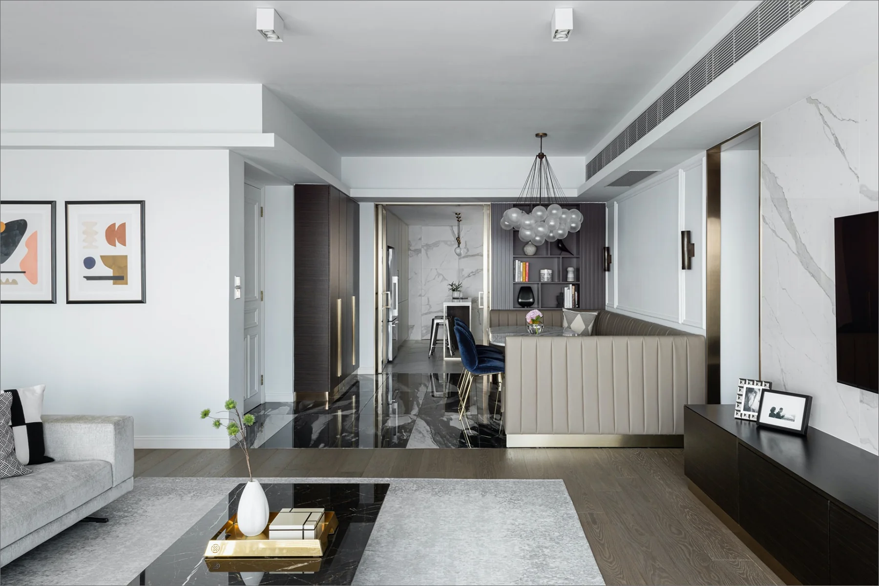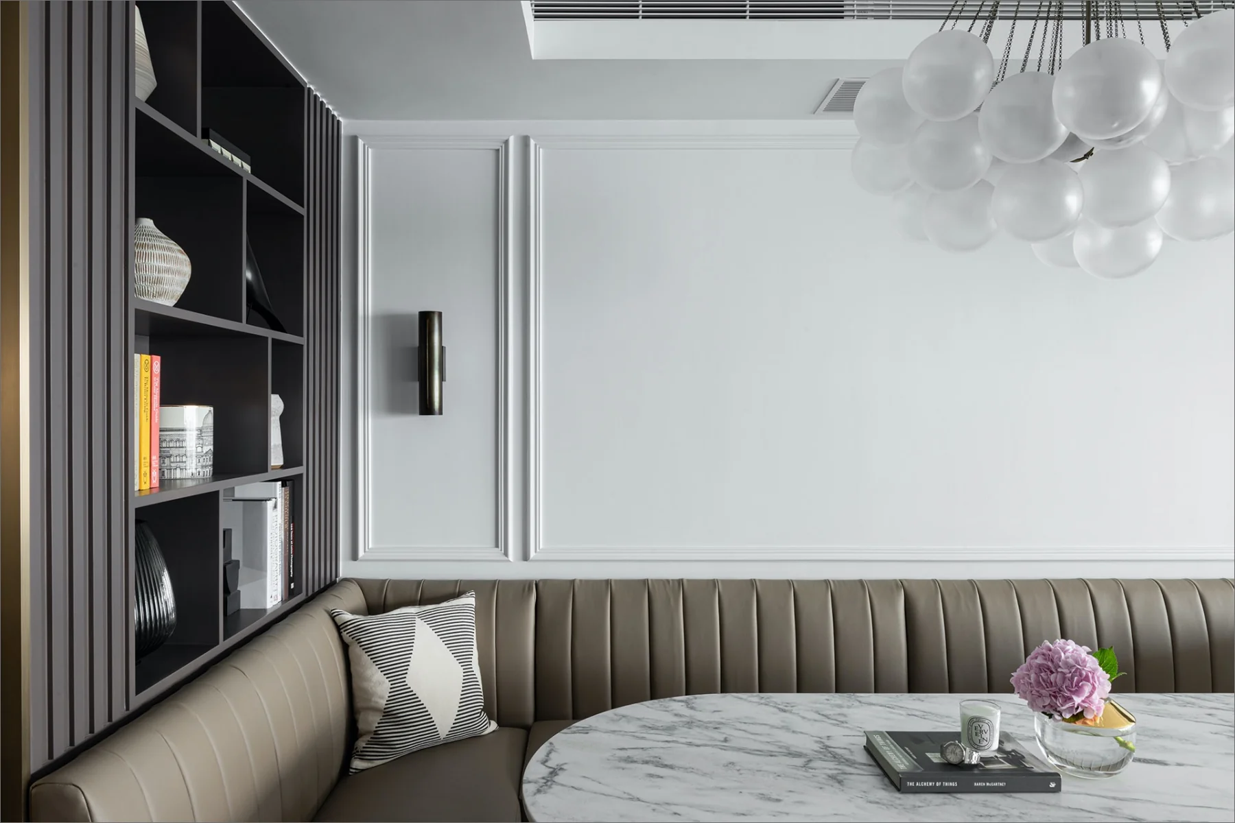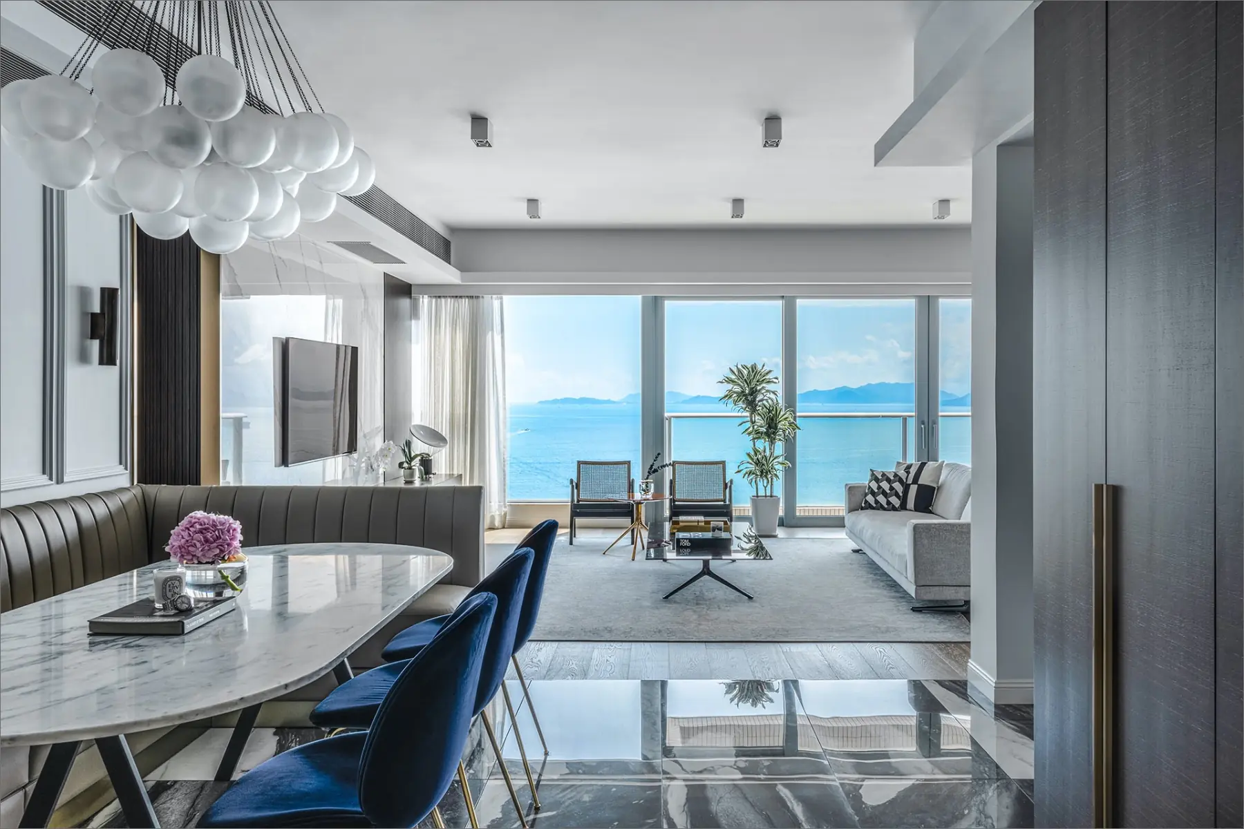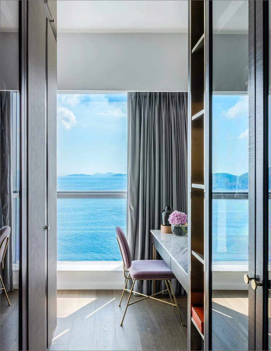 Originally a four-bedroom apartment, YC enlarged the master suite to allow the couple to wake up to stunning views each morning. The children's bedrooms reflect their colour preferences while incorporating mature details for their growth. A hidden study behind the living area provides a functional workspace when needed. The dining room exudes the ambiance of a Michelin-star restaurant, featuring an artistic pendant light and comfortable seating to create a welcoming entrance.