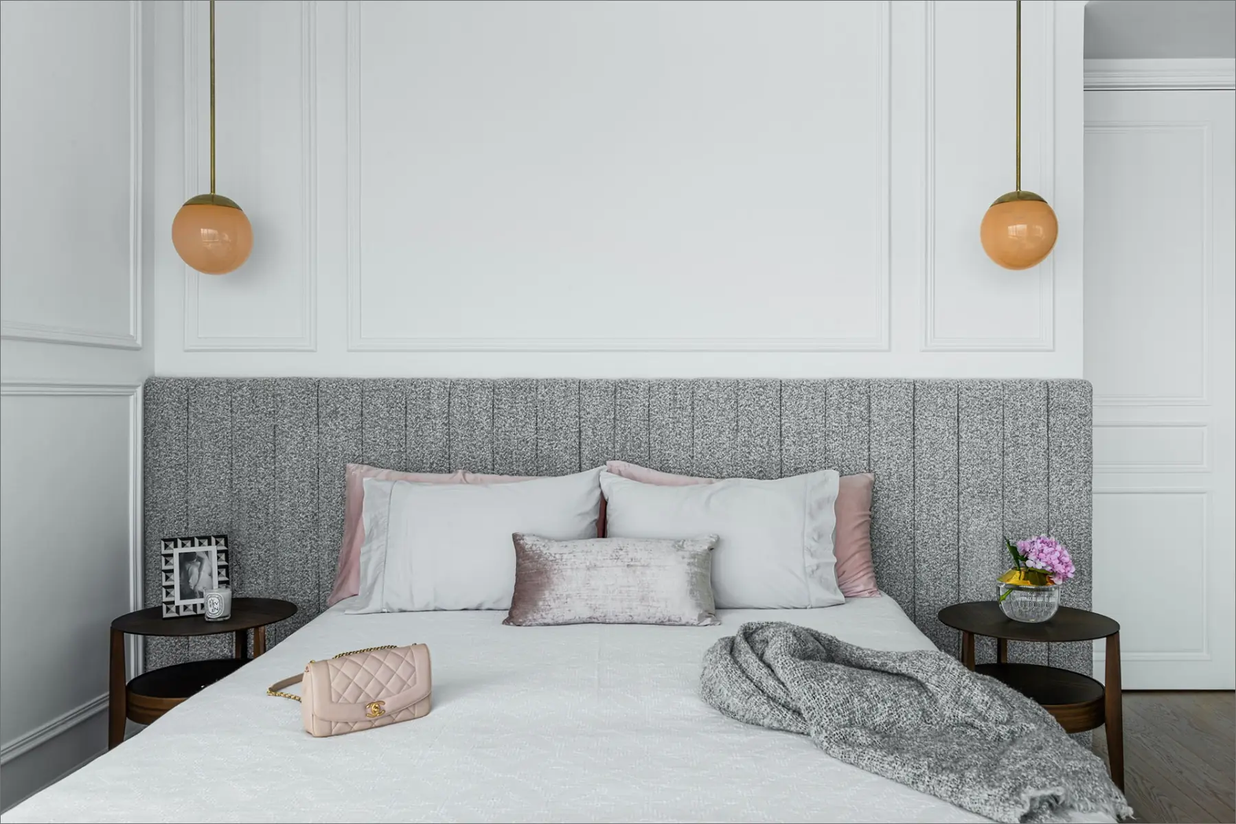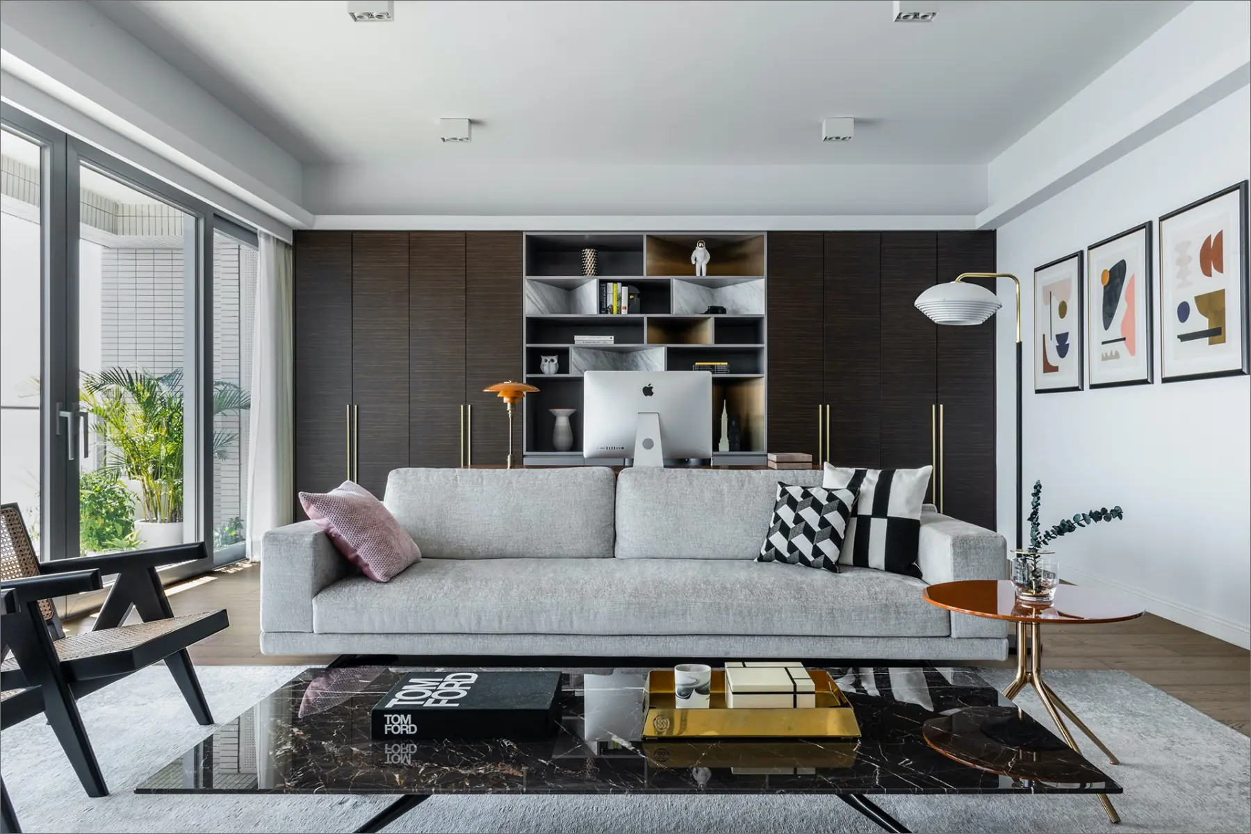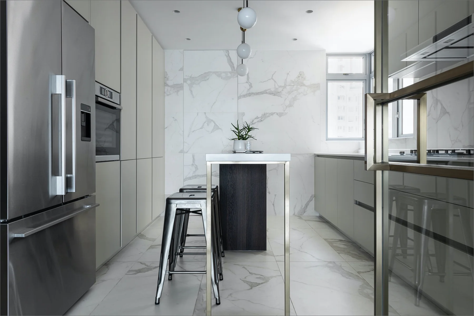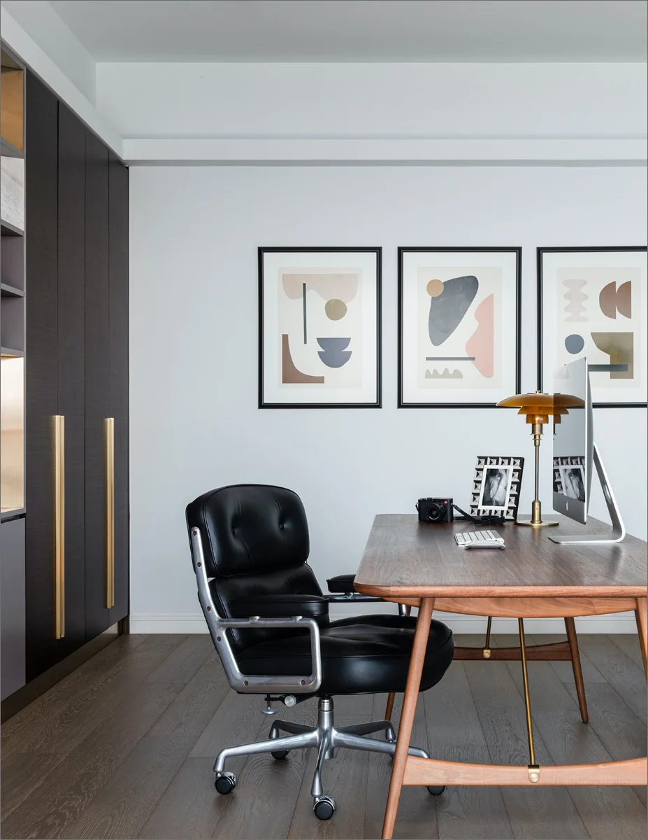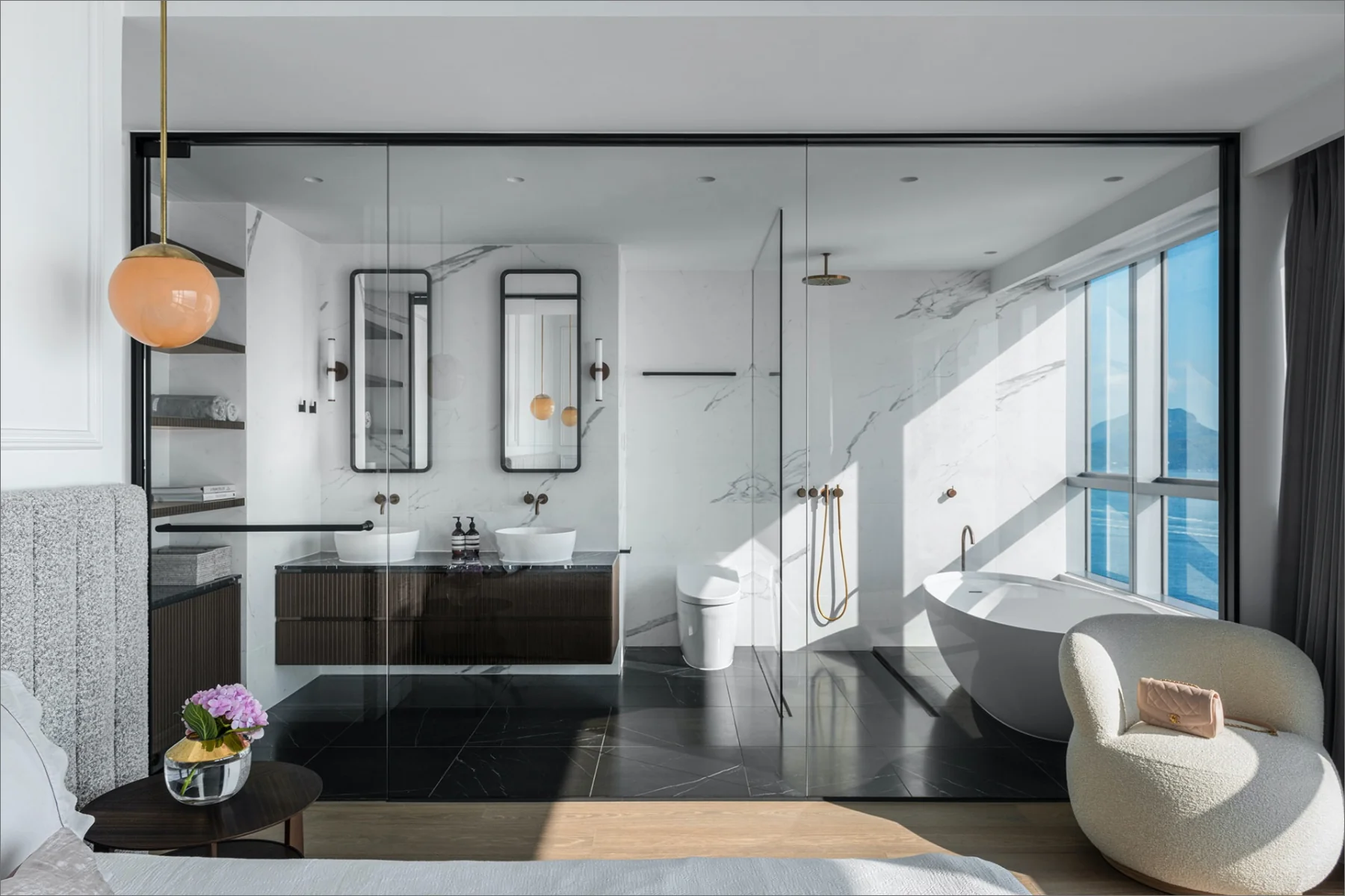 Originally a four-bedroom apartment, YC enlarged the master suite to allow the couple to wake up to stunning views each morning. The children's bedrooms reflect their colour preferences while incorporating mature details for their growth. A hidden study behind the living area provides a functional workspace when needed. The dining room exudes the ambiance of a Michelin-star restaurant, featuring an artistic pendant light and comfortable seating to create a welcoming entrance.