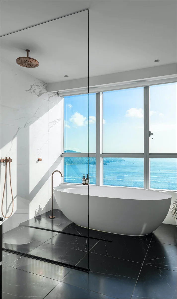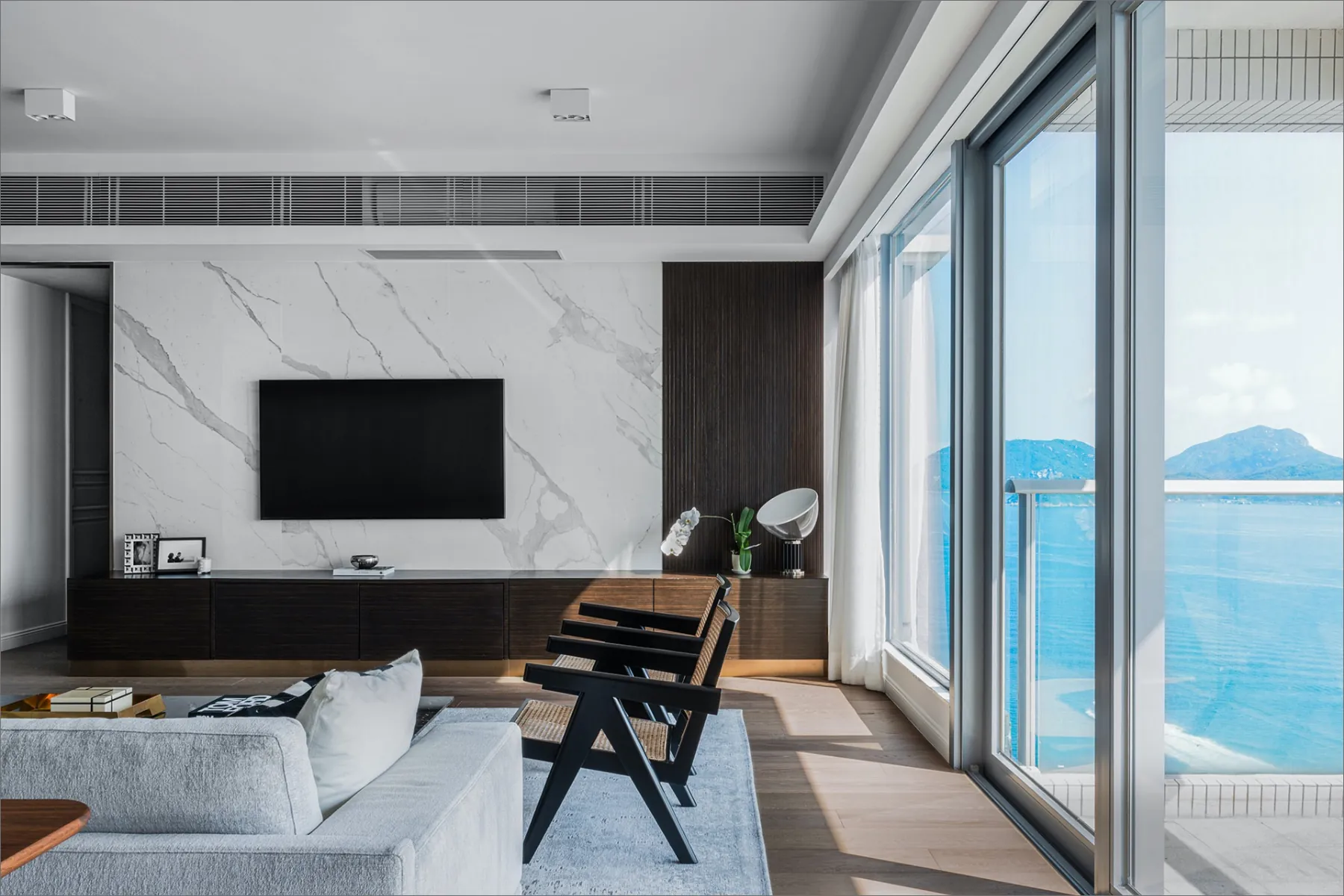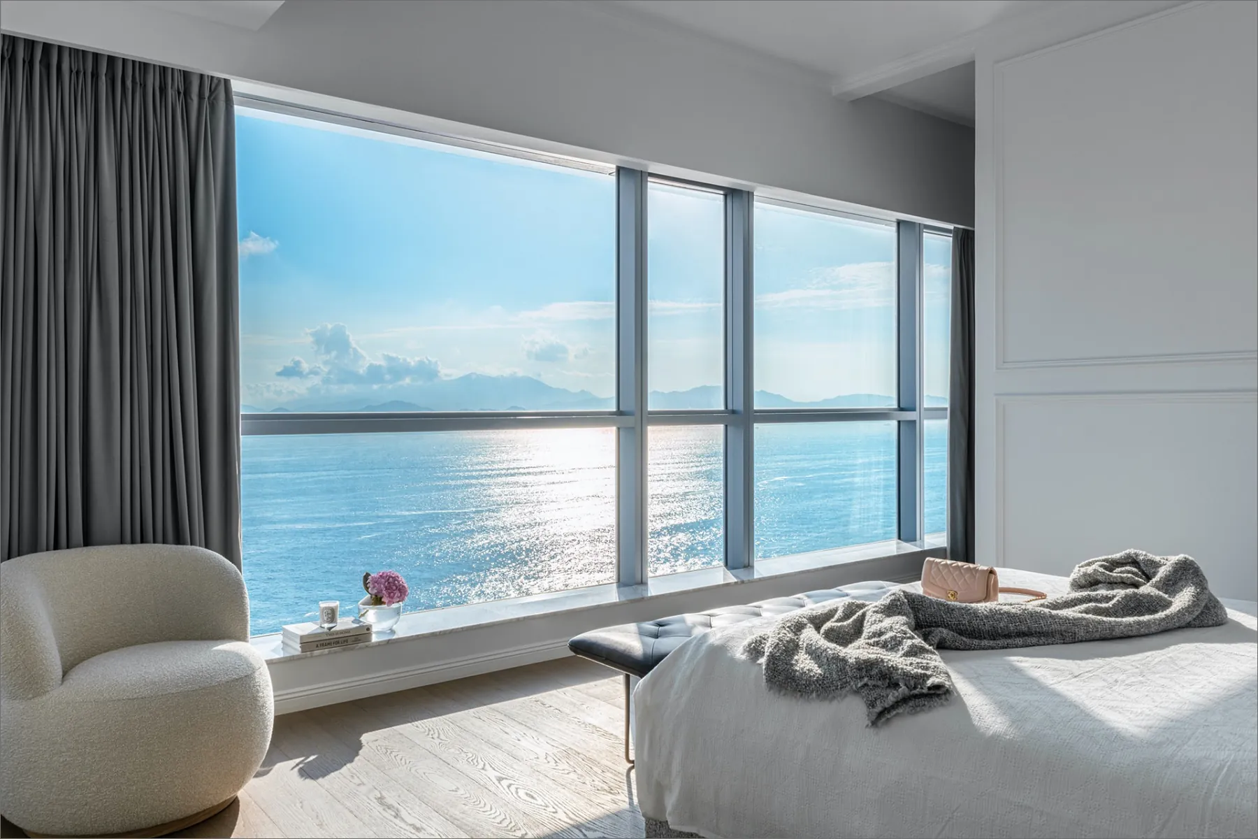 Upon entering this home, guests are immediately captivated by breathtaking panoramic views of the blue sky and tranquil ocean, creating a serene atmosphere. To complement this heavenly setting, YC opted for an understated luxury style.