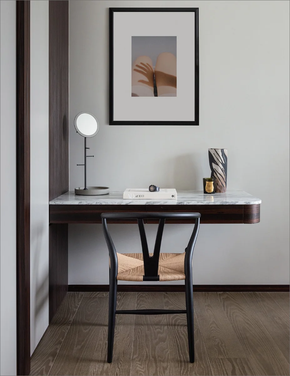 This three-bedroom apartment required no significant layout changes to achieve its desired aesthetic, featuring a master suite for the parents, a suite for the daughter complete with a walk-in closet, and an expansive study that connects to an adjacent room, catering to her diverse musical interests.