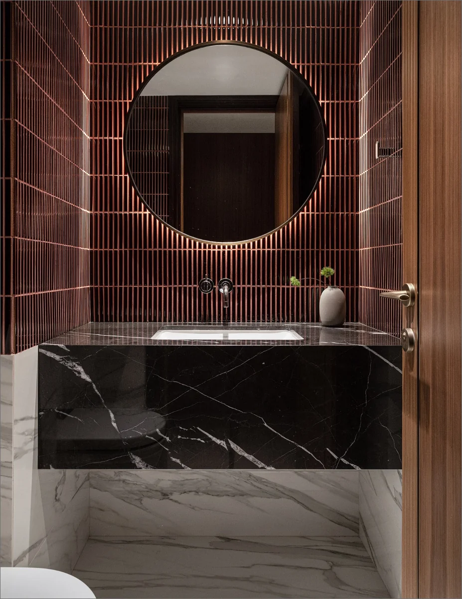 There is a separate powder room is designated for guests. The entire space is enveloped in retro hues, celebrating the hidden beauty of urban living. Serene and calming, yet bold and subtle, this apartment stands apart from the ordinary, offering a distinctive charm that is truly one of a kind.