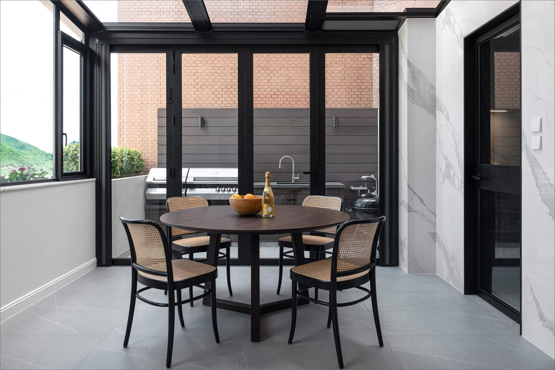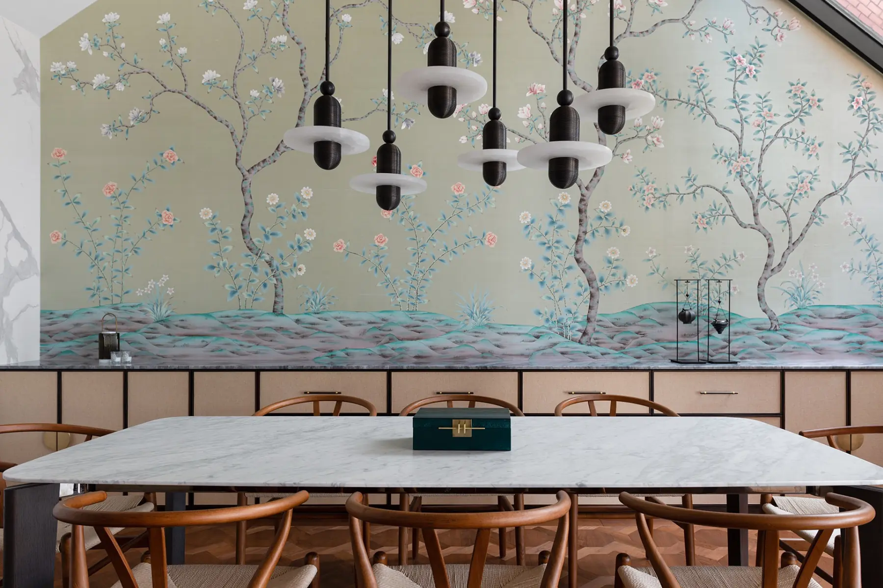 For a couple that has developed a fondness for Oriental style, YC helped them choose the theme for their new home. Upon entering, guests are greeted by a foyer with a hidden powder room and cloakroom. The spacious living room features a collector’s Chinese painting and a striking feature wall. Downstairs, the main dining room boasts hand-painted Chinoiserie wallpaper, while a cozy breakfast nook in the family room adjoins the kitchen, along with a barbecue area for casual gatherings.