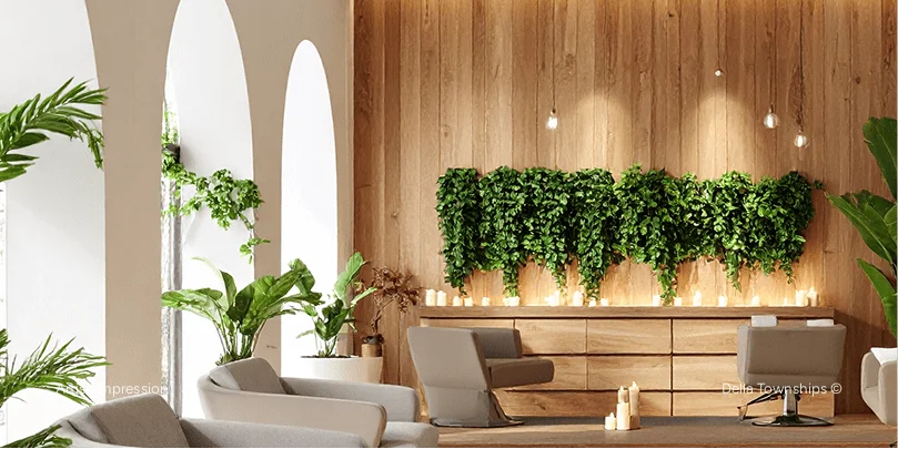 Integrating natural elements like wood and stone to indoor spaces to boost mental well-being and lower stress levels through biophilic design.