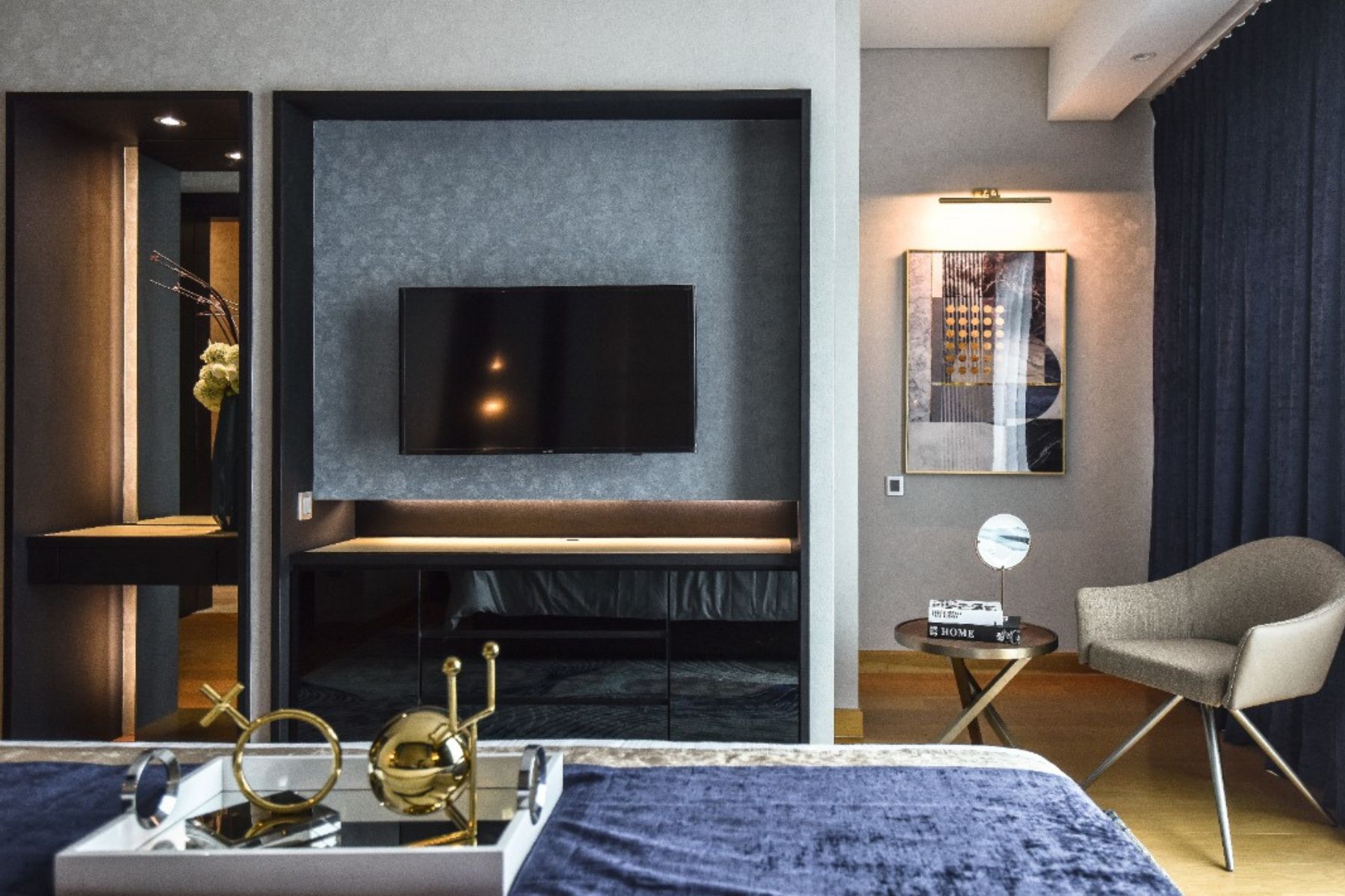 Nestled in the heart of an urban oasis, the Ritz Carlton Residence displays impeccable modern design. The living area is a blend of comfort and style, featuring plush seating and sun-drenched floor-to-ceiling windows that offer breathtaking panoramic views. Natural light enhances the carefully selected artwork and warm, neutral colour palette.