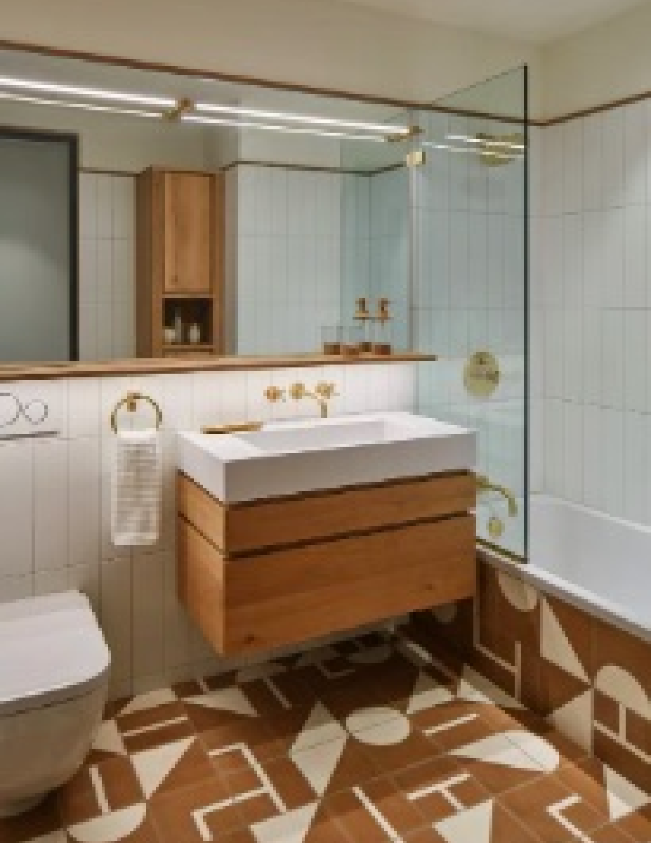 Transforming this high-ceilinged, exposed-pipe loft into an elegant apartment involved carefully selecting touches of domesticity and luxury. The kitchen walls showcase DF&A’s approach – industrial brick remains intact but is painted white, with the lower half adorned in wainscoting. Dominated by shades of gray, the kitchen serves as the focal point of the space, maintaining its industrial character with visible elements and a monochromatic palette. Subtle brass details add a touch of warmth, infusing the entire apartment with a sense of life.