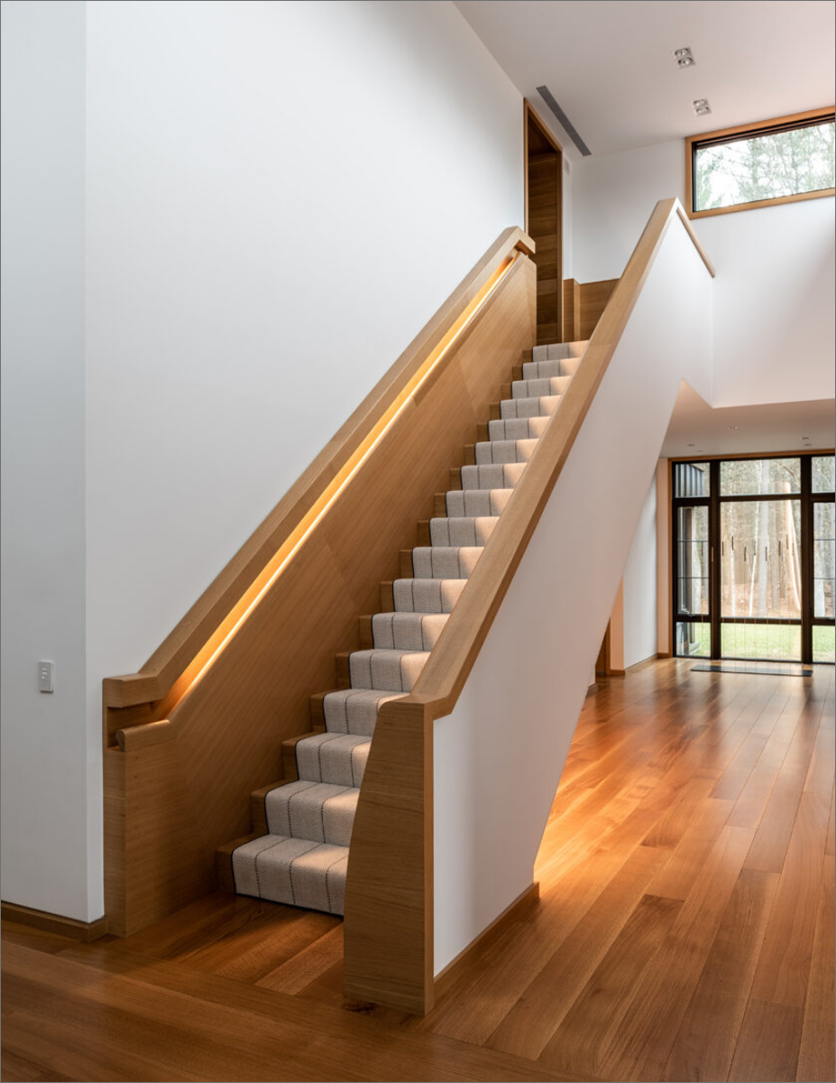 Double-height gallery spaces display the couple's art and help organize the interior, with public living areas on one side and retreat spaces on the other. Timber plays a significant role in harmonizing the house with its natural environment, while locally sourced granite anchors the structure to the site. The deep copper fascia accentuates the home's horizontal lines, enhancing its connection to the landscape.