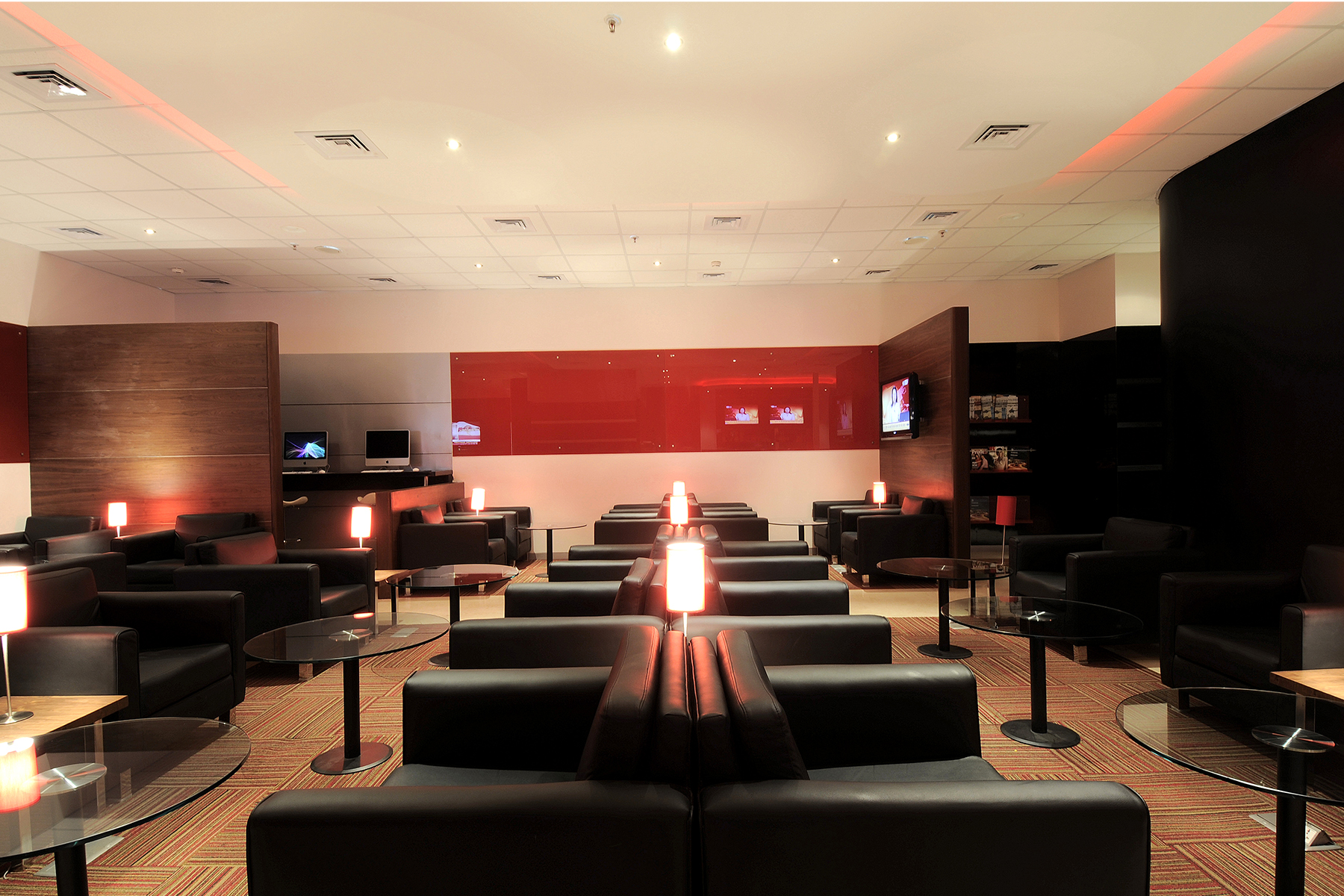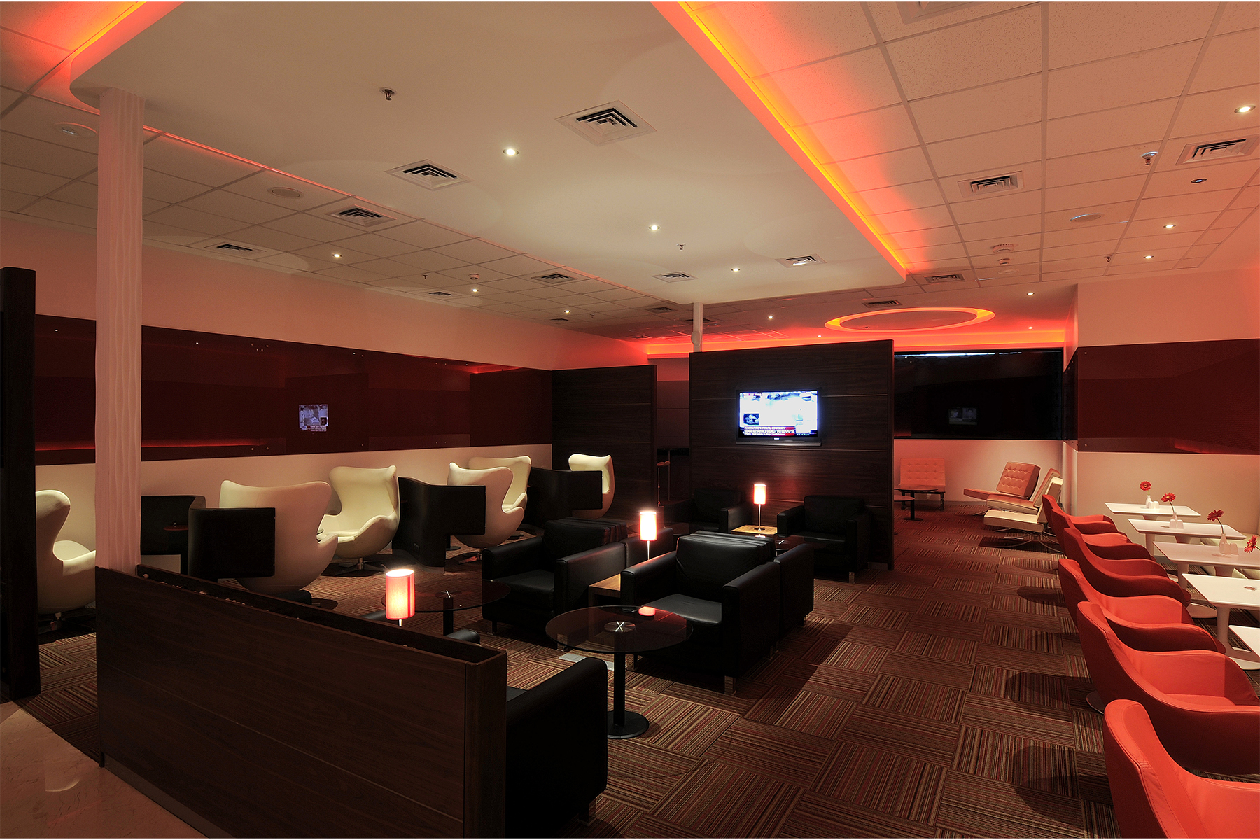 His use of the corporate red hues offset by black overtones, high gloss PU and Pearl finished Italian marble added an illusion of grandeur aided by strategically designed and placed lighting.