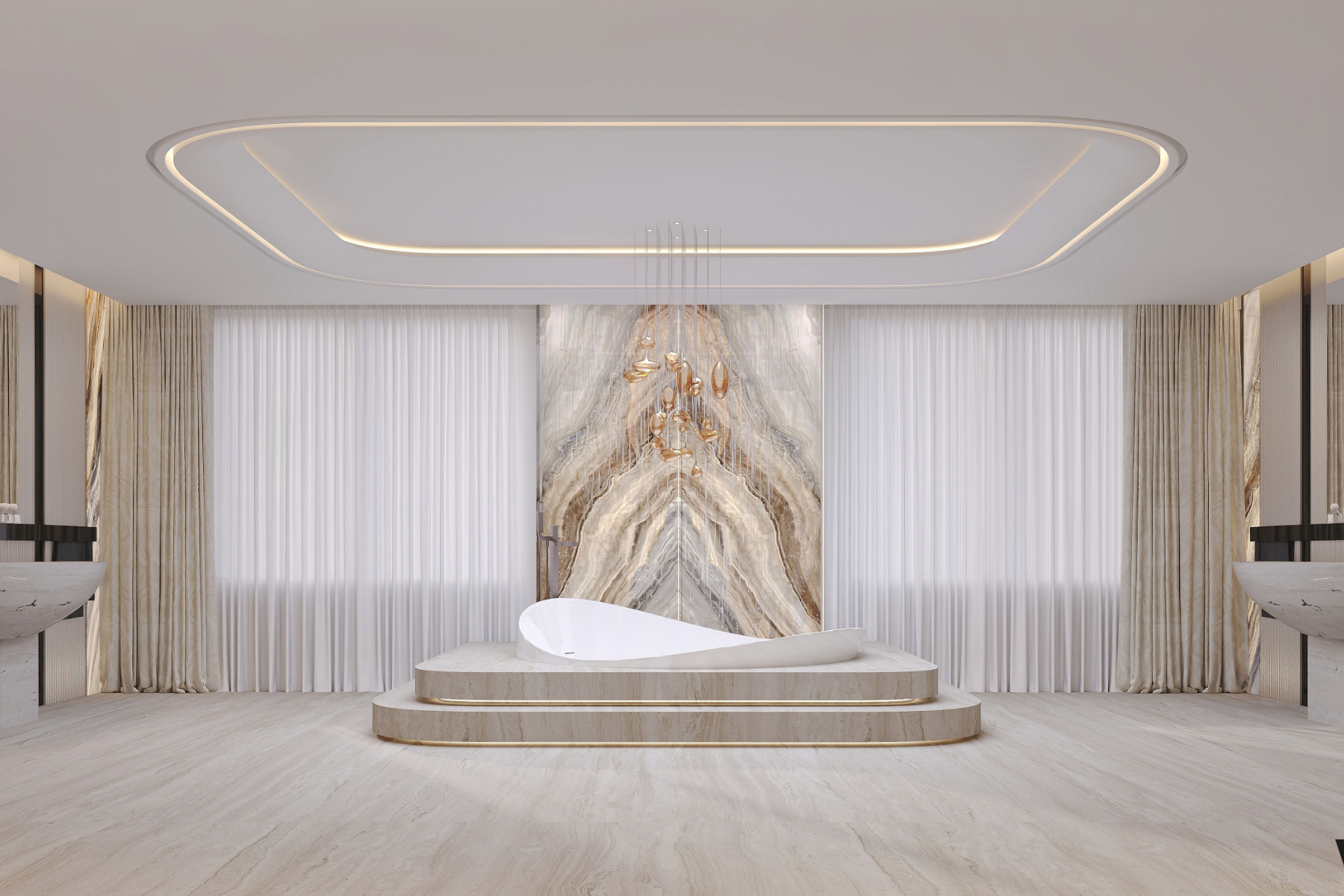 Key features include a distinctive elliptical cove ceiling with subtle lighting and hidden air conditioning, enhancing the space's organic aesthetic. The walls are adorned with travertine marble, while the terrace showcases a unique landscape design, adding to its elegance. Nestled within the W Hotel, the penthouse provides spectacular views of the sea and Dubai skyline.