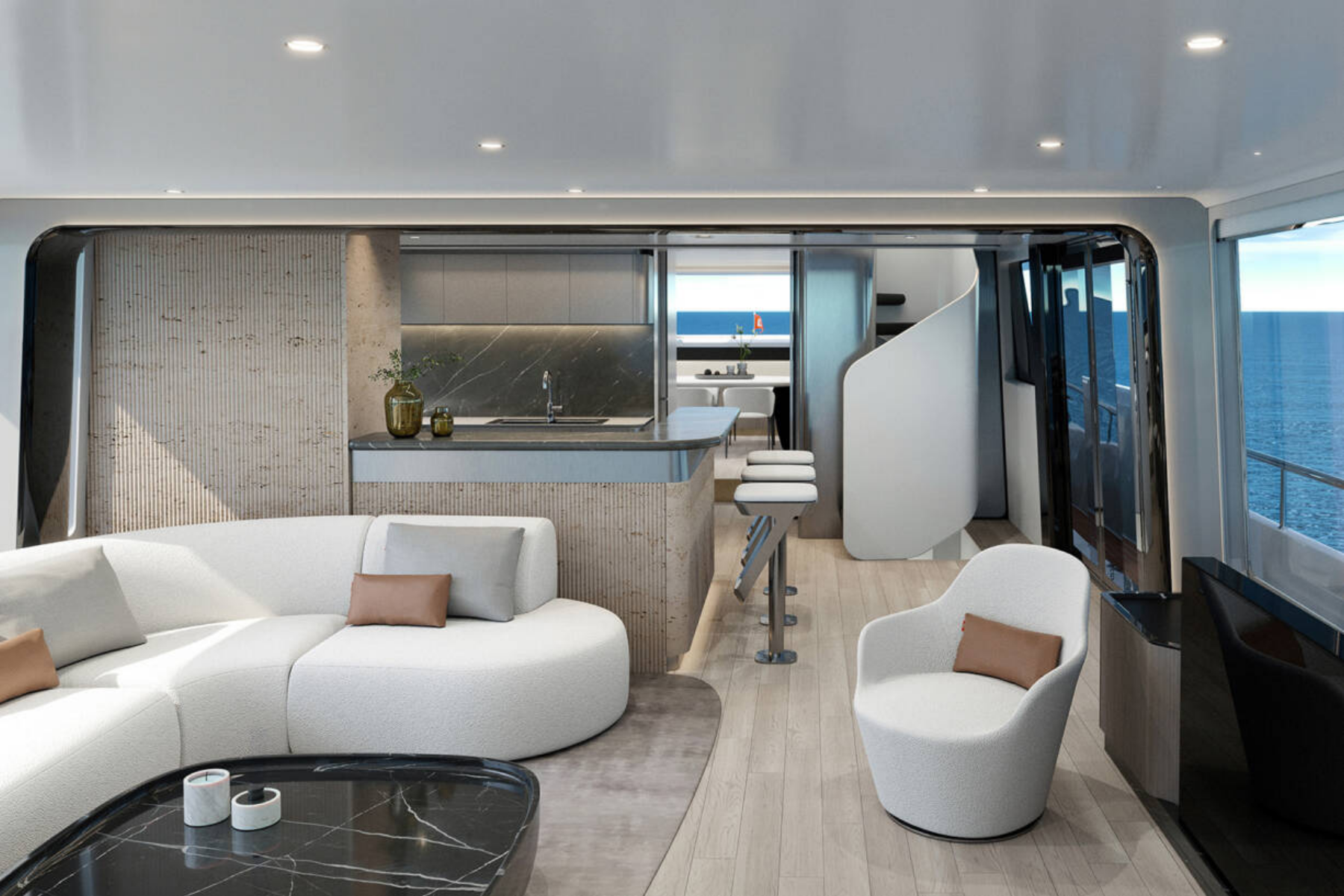 The evolved sundeck, sky lounge, and flybridge retain the iconic 'Terrazza Portoghese' while CLX99 epitomises contemporary nautical luxury's pinnacle.