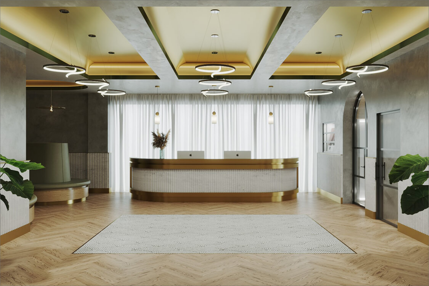 This bespoke clinic fit-out in central Mauritius features five surgical rooms, including a state-of-the-art oral surgery suite. Additional amenities include a lab, recovery room, and CBCT room. The public spaces showcase high-end finishes, with custom elements like a curved timber soffit, wall light boxes, and mosaic tile floors.