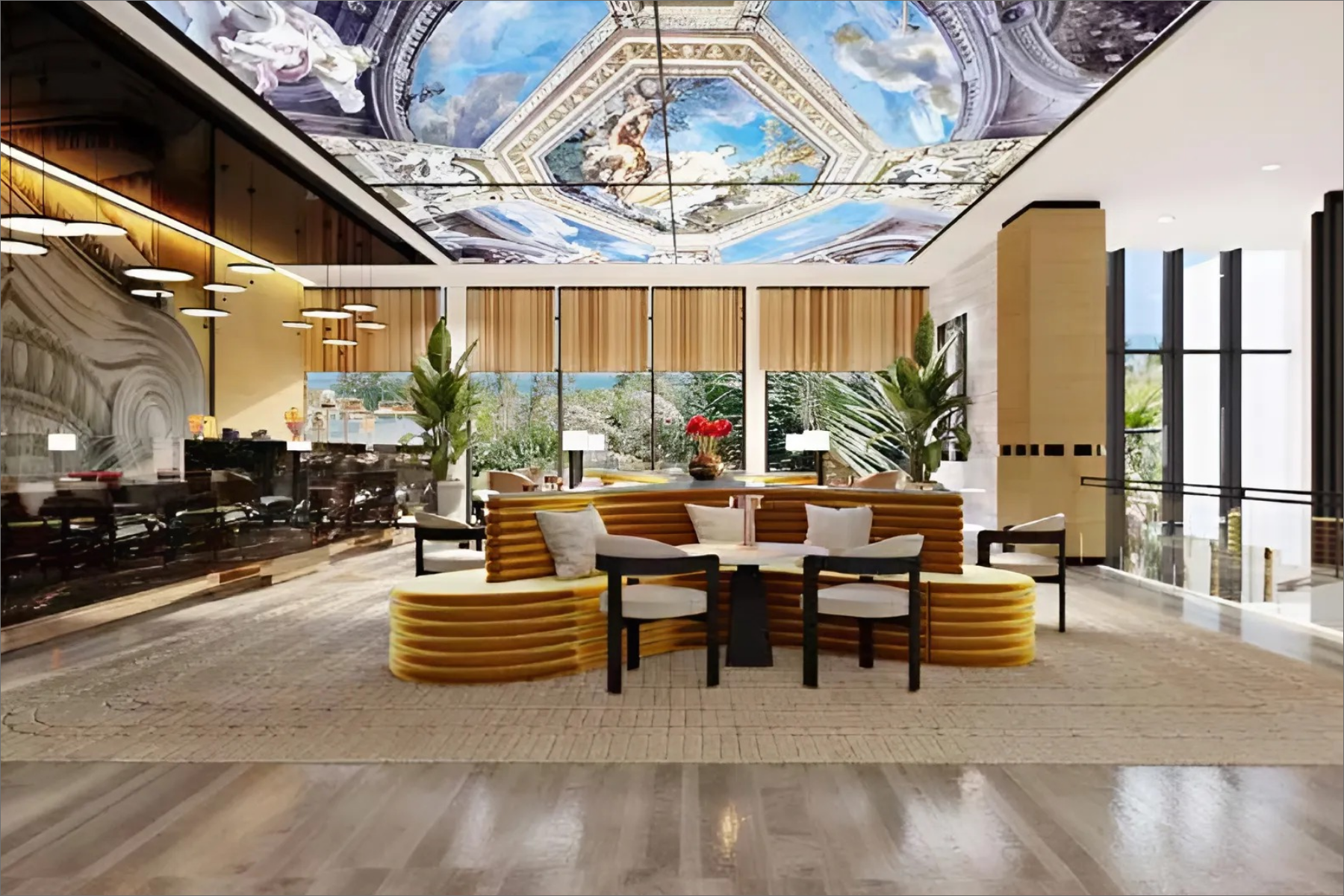 Every area of the hotel draws inspiration from the Roman era, featuring modern Renaissance aesthetics that create an air of mystery and engage guests. We've designed private spaces with Roman-inspired drapery and wooden panels, adorned each area with customised frescoes, and selected furniture and materials that reflect the Renaissance, including velvet fabrics, curved sofas, and large ceramic planters.