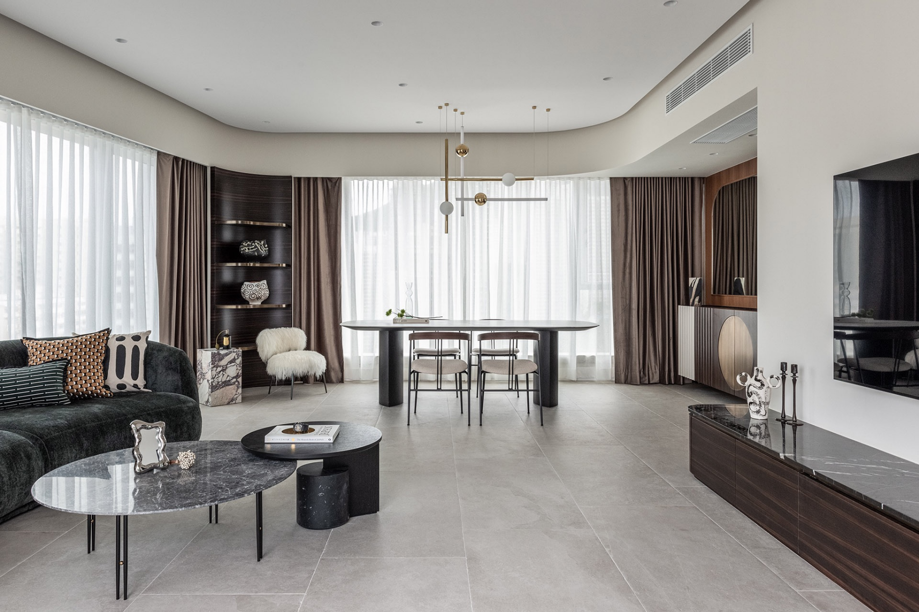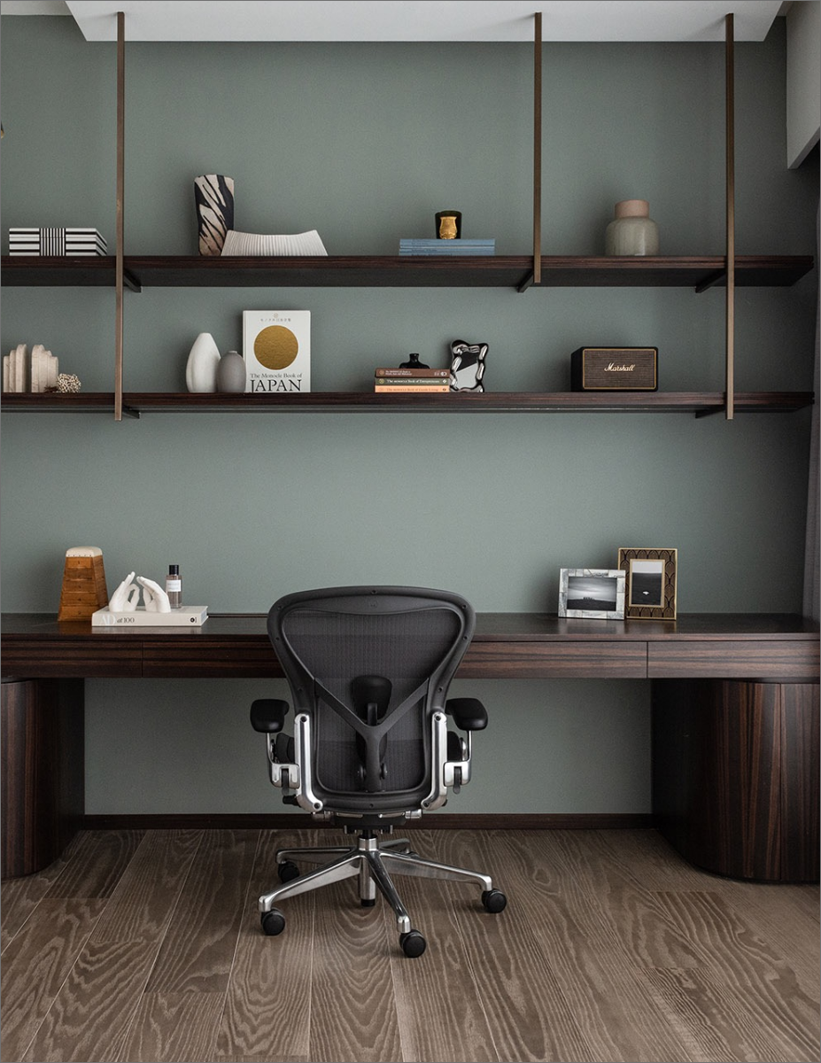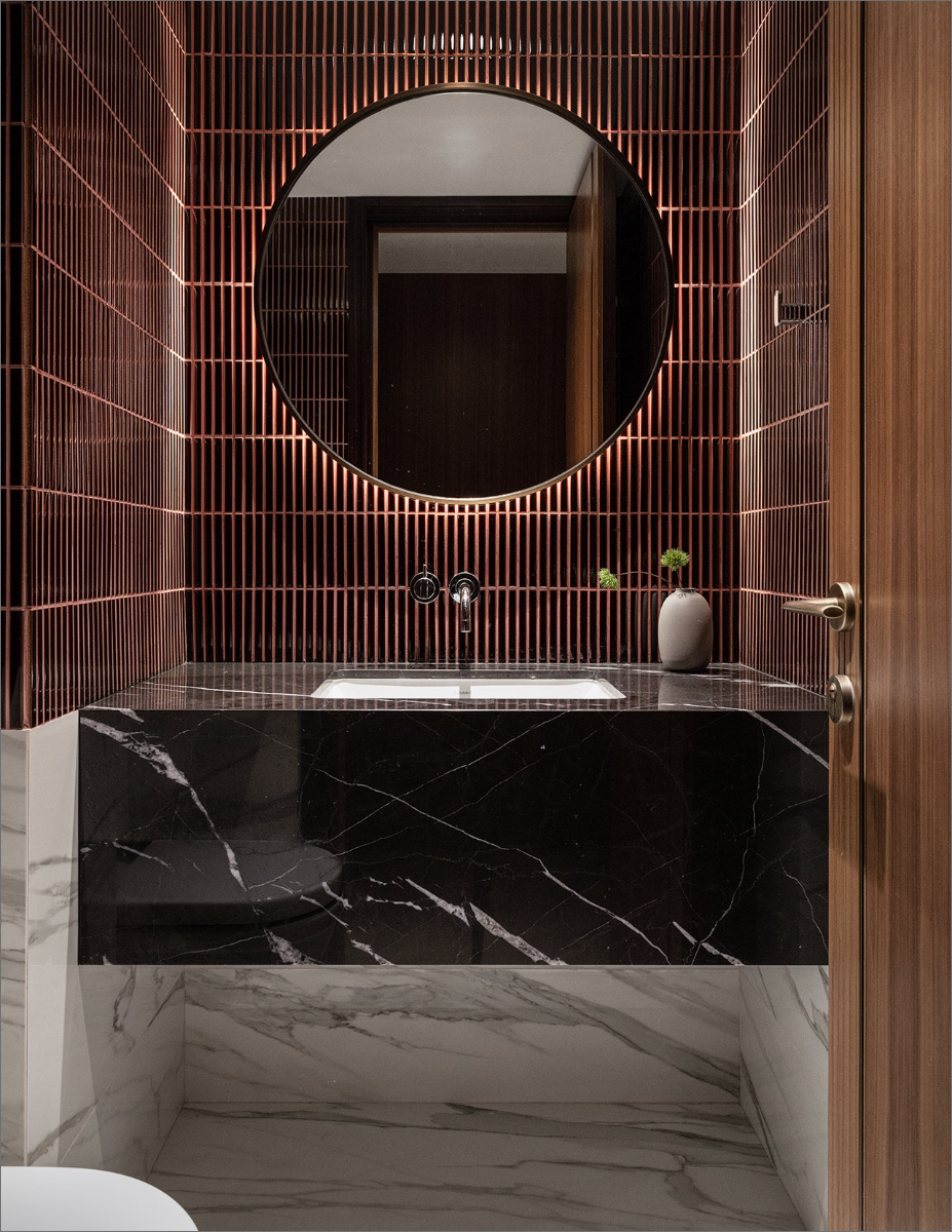 This three-bedroom apartment required no significant layout changes to achieve its desired aesthetic, featuring a master suite for the parents, a suite for the daughter complete with a walk-in closet, and an expansive study that connects to an adjacent room, catering to her diverse musical interests.