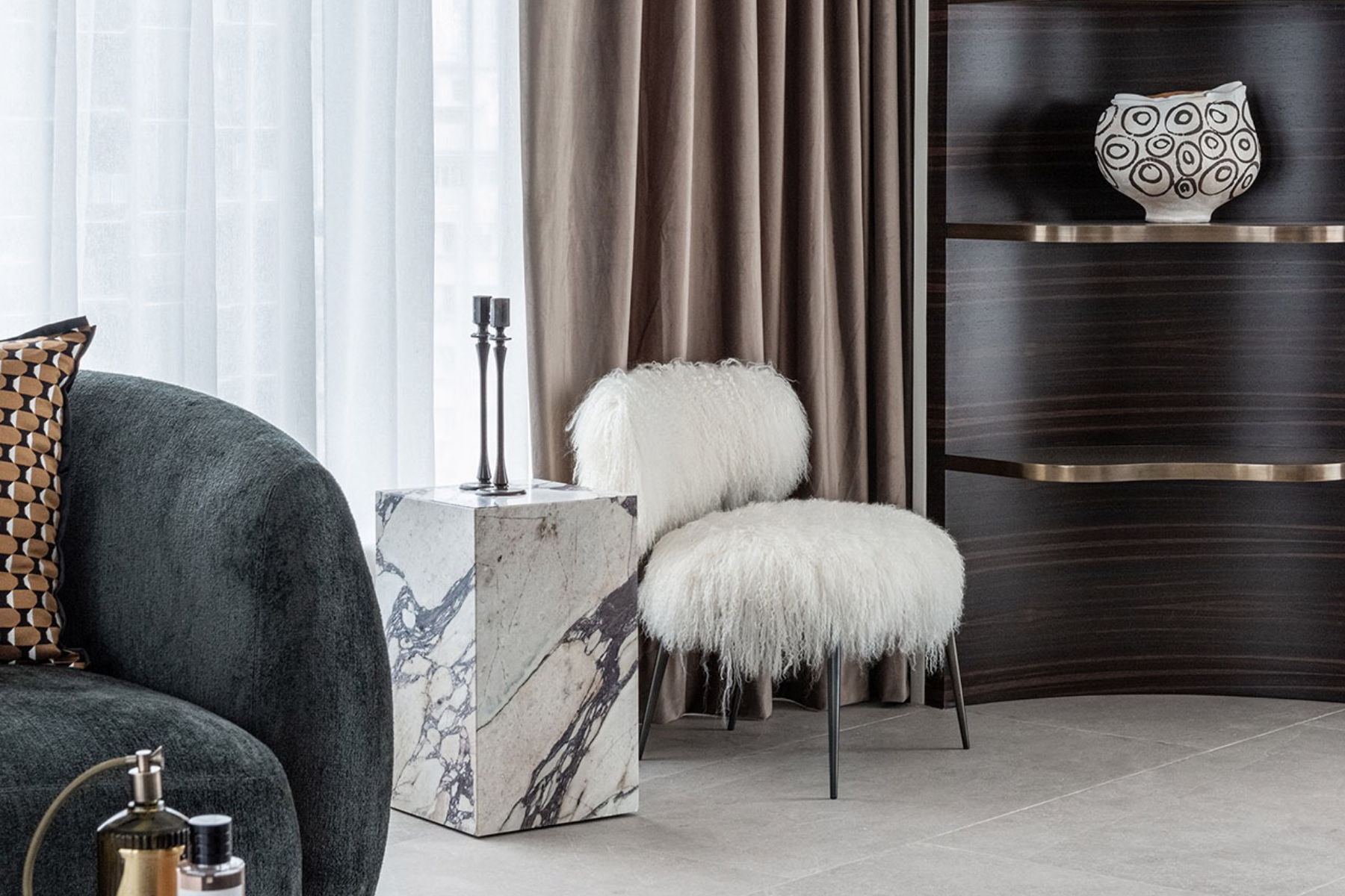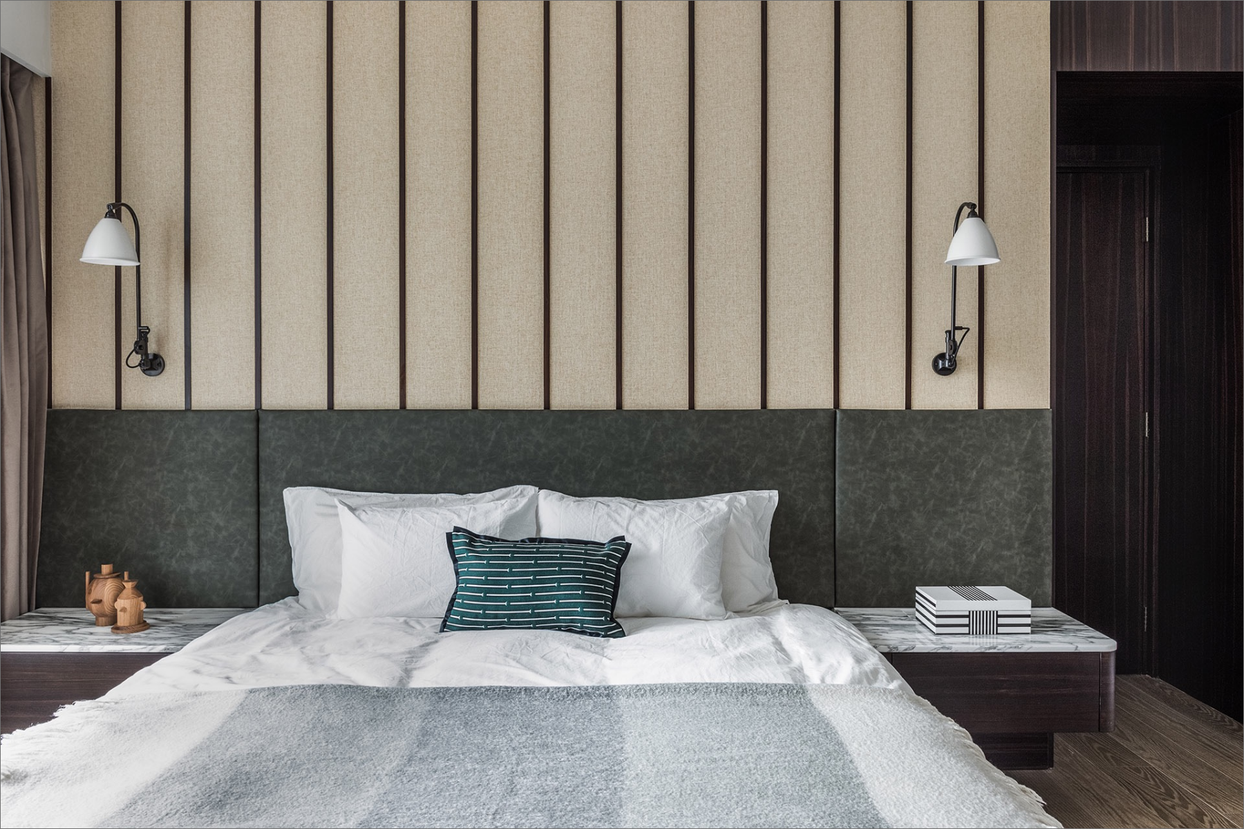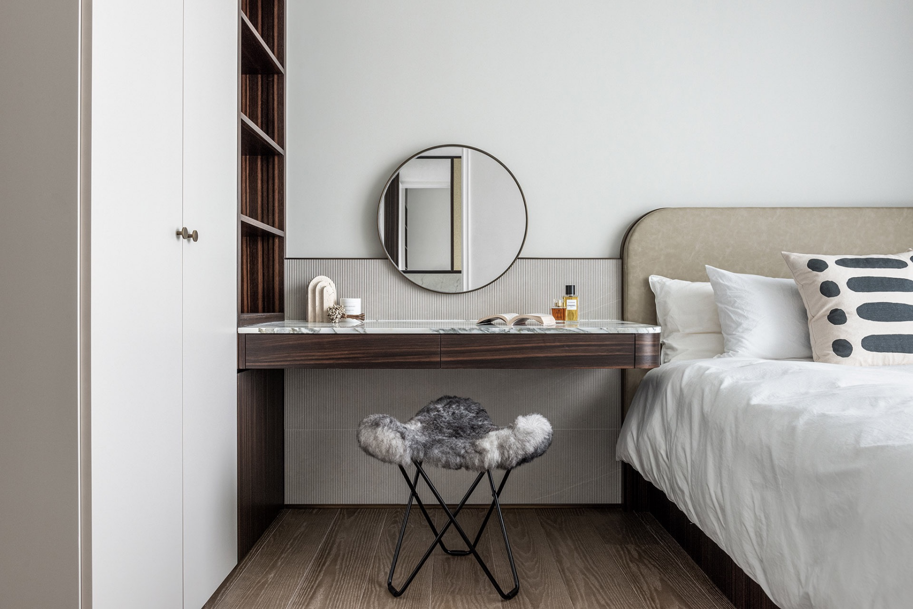 This three-bedroom apartment required no significant layout changes to achieve its desired aesthetic, featuring a master suite for the parents, a suite for the daughter complete with a walk-in closet, and an expansive study that connects to an adjacent room, catering to her diverse musical interests.